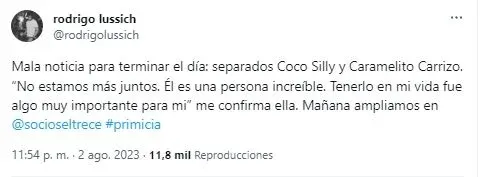 El mensaje de Rodrigo Lussich al anunciar la separación de Caramelito Carrizo y Coco SilyEl mensaje de Rodrigo Lussich al anunciar la separación de Caramelito Carrizo y Coco Sily.