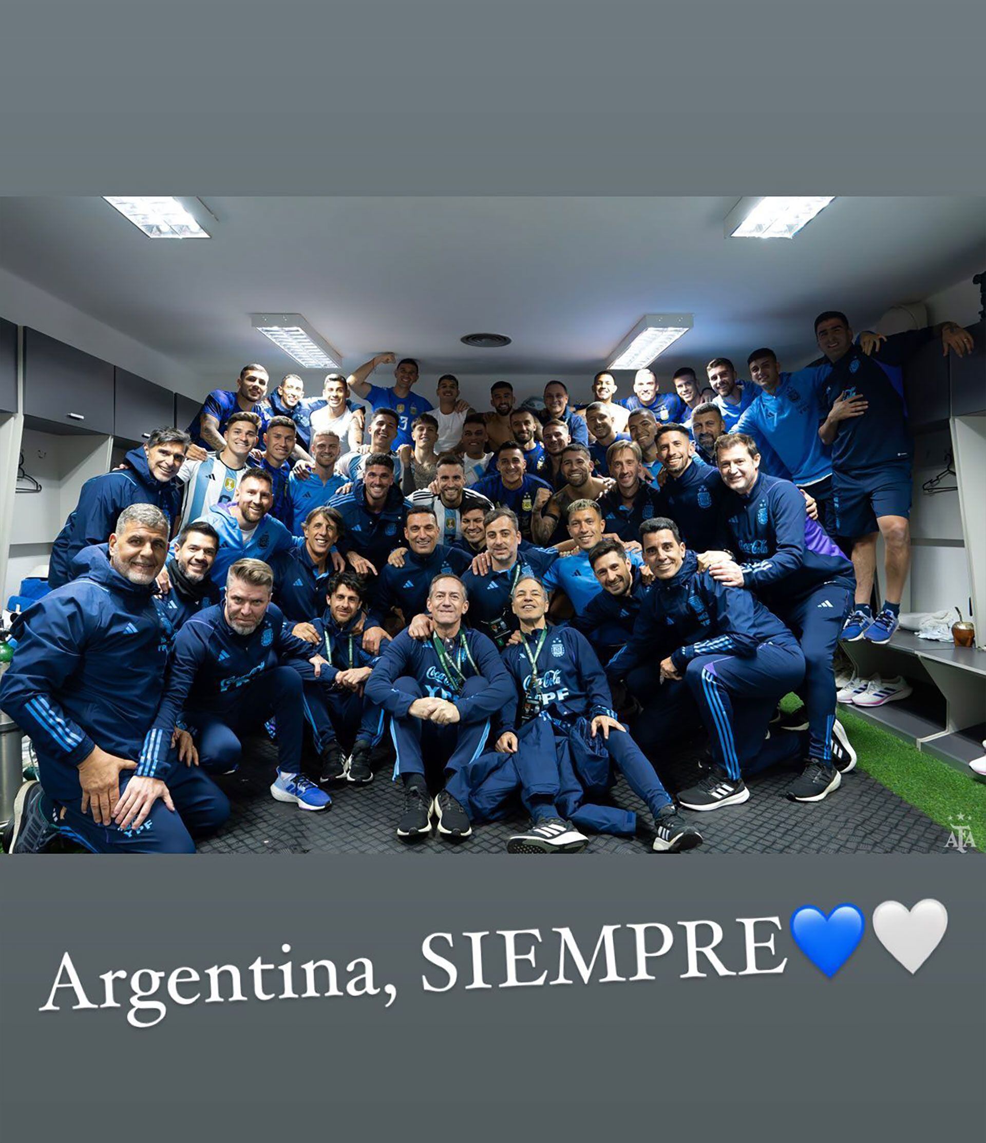 Sus sentimientos los dejó expresados en dos historias en Instagram. En la primera puso una foto del festejo en el vestuario con todos sus compañeros y el resto de la delegación Albiceleste. “Argentina, siempre”, escribió y puso dos corazones con los colores de la bandera nacional.